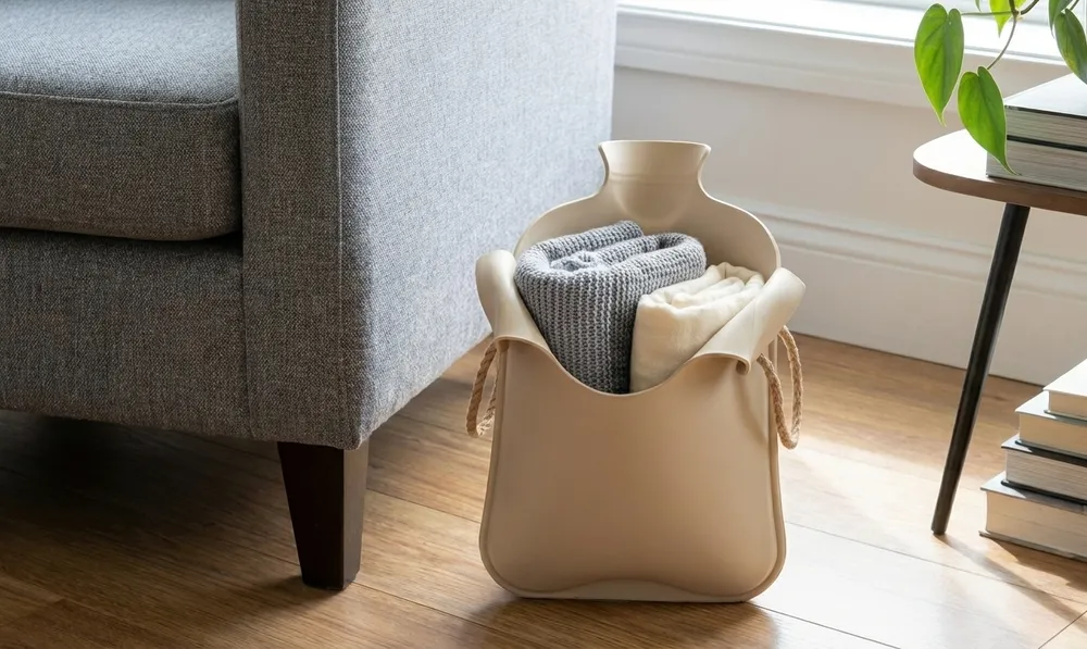 Poduszka z gorącą wodą, której już nie używasz, ponieważ jest przebita lub straciła elastyczność, nie musi trafić do kosza. Dzięki wytrzymałej i elastycznej gumie można go poddać recyklingowi i przekształcić w ozdobny pojemnik na lekkie koce, idealny do salonu lub sypialni. To nieoczekiwany sposób na recykling, który dodaje designu i porządku w domu.