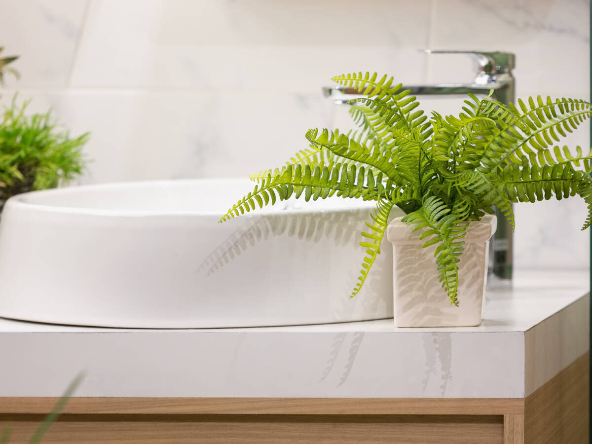 Paproć w łazience nie tylko korzysta z wilgoci w otoczeniu, ale także ją pochłania. Archiwum magazynu Jardin